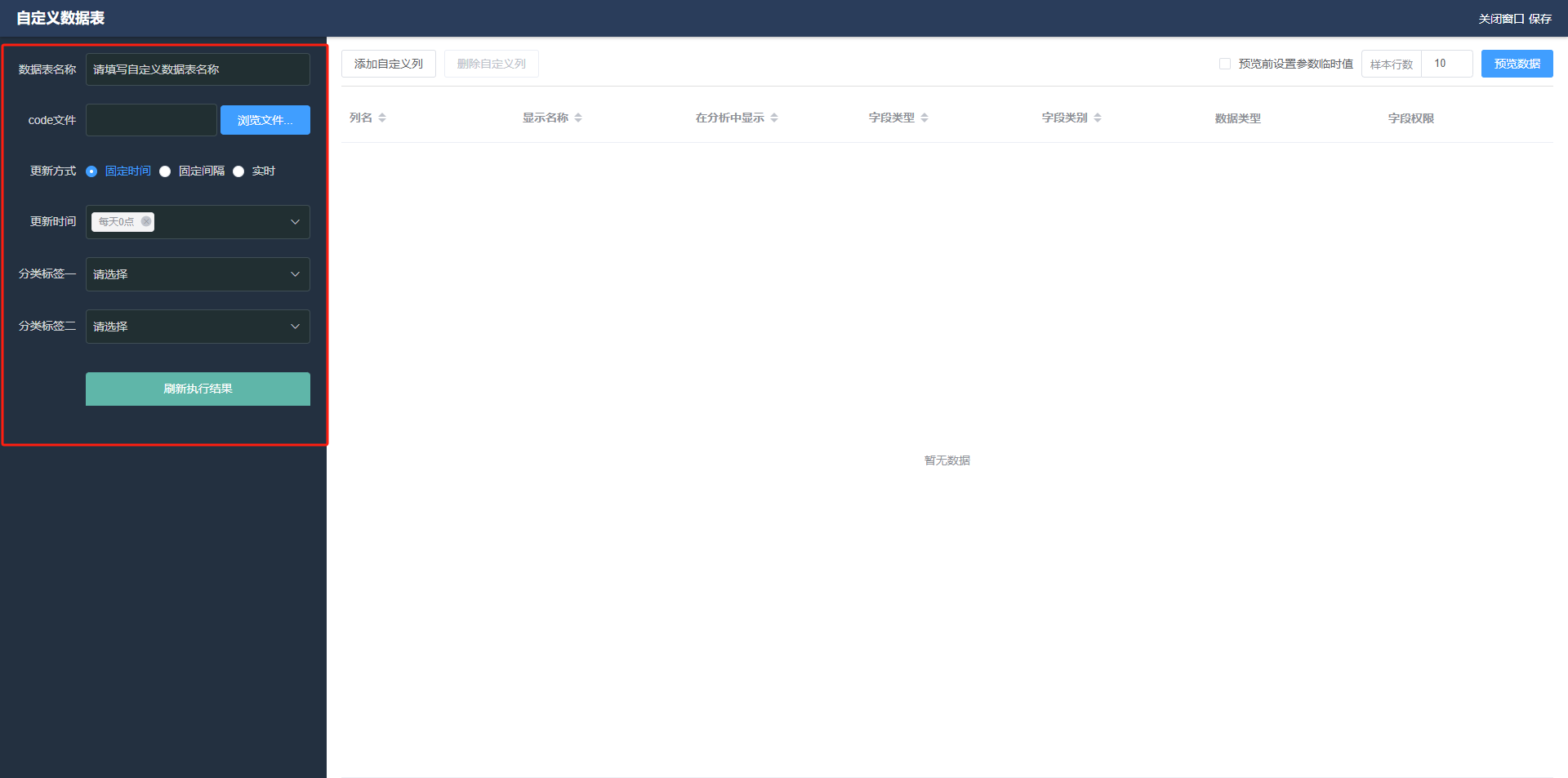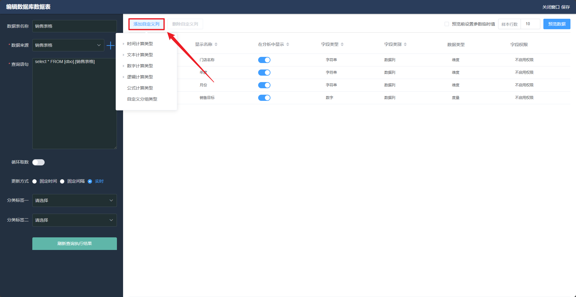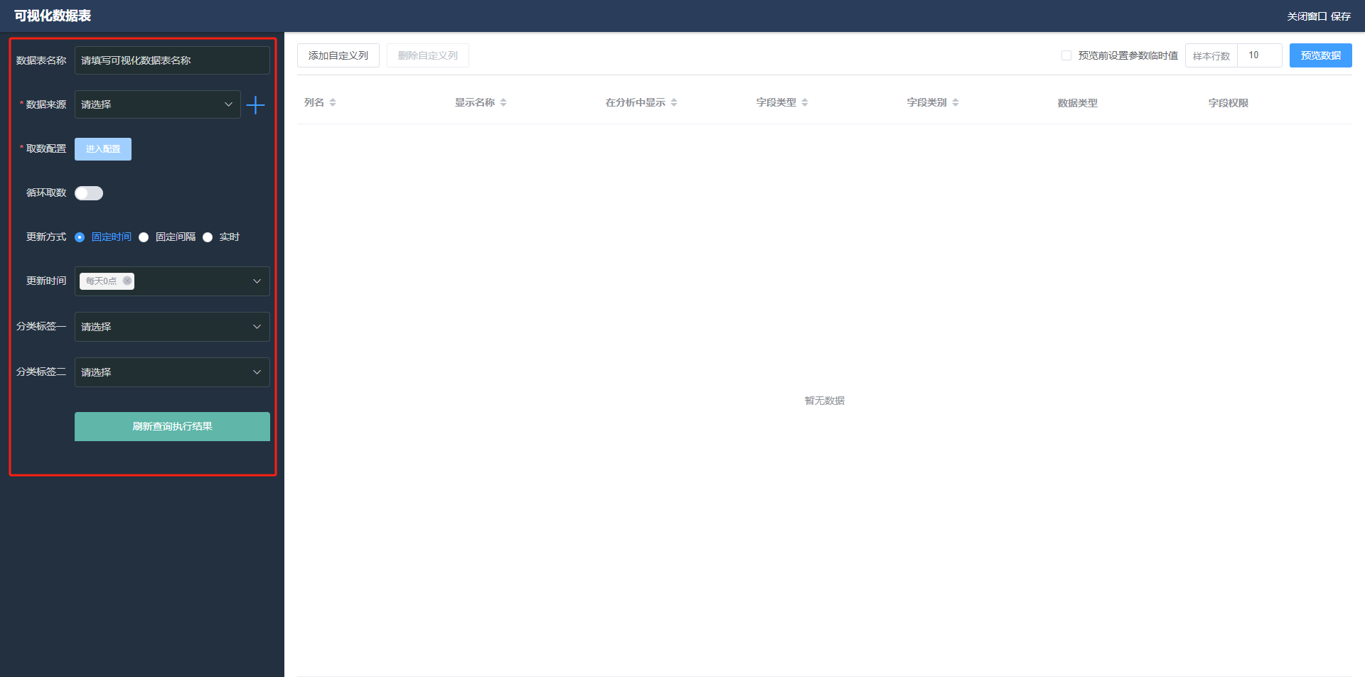 ## 一、产品模块概述 ### 1.概述 FastBI支持创建多种类型的数据表,具体包括: 1. **数据库数据表**:可以连接到各种数据库,如MySQL、SQL Server、Oracle等,直接在FastBI中创建对应的数据表。 2. **可视化数据表**:通过FastBI的可视化数据表新建与配置,可以用于报表和大屏的数据表,这些数据表通常与图形控件配合使用,以实现数据的图形化展示。 3. **Excel数据表**:FastBI允许用户直接上传Excel文件并创建数据表,无需事先创建数据源连接,这种数据表适用于那些已经准备好的本地数据文件。 4. **HTTP接口数据表**:用户可以创建接口数据表,通过输入接口的URL地址和返回结果的XPath来获取网络上的数据,并将其整理成数据表。 5. **自定义数据表**:对于有特殊需求的用户,FastBI提供了创建异构数据表的功能,可以在已创建的数据表基础上进行二次处理,如将不同数据库类型的数据进行关联合并。 6. **API数据表**:FastBI提供了丰富的API接口,支持用户通过API来创建和管理数据表,这为二次开发和深度定制提供了便利。 ### 2.产品模块入口 点击【数据集市】-【数据表管理】即可进入数据表管理。  ## 二、产品模块使用 ### 1. 新建数据表 点击【新建数据表】按钮  #### 1.1. 新建数据库数据表 首先将数据库与FastBI创建连接详细可参考【数据源管理】-【添加】: https://doc.tizdata.com/fastbi/695 然后进行如下操作; 点击【新建数据表】-【数据库数据表】  在此处需注意,【数据来源】必须在新建该数据库数据表时就创建好,否则会导致此处无数据来源; 【查询语句】中需要输入您需要执行的sql语句; 将所有信息设置完成后必须点击【刷新查询执行结果】,然后与数据库字段比对查看信息是否有误,若无误点击保存即可。  #### 1.2. 新建可视化数据表 首先将数据库与FastBI创建连接详细可参考【数据源管理】-【添加】: https://doc.tizdata.com/fastbi/695 然后进行如下操作; 点击【新建数据表】-【可视化数据表】  在此处需注意【取数配置】项点击【进入配置】可进入可视化配置,可以将需要的数据表拖动到右侧,然后选择想要查看的字段,完成后点击保存。  在此处可以对数据表进行设置点击编辑即可进入该表格的设置窗格  设置方法可参考文档: https://doc.tizdata.com/fastbi/739 在【可视化数据表】中填写完成后点击【刷新查询执行结果】提示成功即可。  #### 1.3. 新建Excel数据表 首先需创建一个excel电子表格,在表格中设置好所需信息,然后进行如下操作; 点击【新建数据表】-【新建Excel数据表】  在【Excel数据表】中填写相关信息,选择【Excel文件】即可。  #### 1.4. 新建Http接口数据表 点击【新建数据表】-【Http接口数据表】  在【接口数据表】中填写相关信息,完成后点击【测试接口】即可。  #### 1.5. 新建自定义数据表 点击【新建数据表】-【自定义数据表】 和接口数据表不同,自定义数据表支持更复杂的接口处理,即带验证类型的接口可以用写python的方式实现。  在【自定义数据表】中填写相关信息,完成后点击【刷新执行结果】即可。 用Python写自定义数据表示例,写完保存,上传到code文件即可: ```python import json import datetime import os #接收的查询参数列表,如果支持带参数查询请将下一行代码放开并填入需要使用的参数名 # param_list = ['用户名', '角色名'] def load_data(rows=-1, params=None, preview=False): ''' rows 表示要获取的数据行数,-1表示所有,0的时候表示只需要返回数据结构, 数据可以是假的 params 是参数数组,格式如下: [ { "name": "用户名", "value": "admin" }, { "name": "角色名", "value": "admin,manager" } ] preview 表示是预览模式,可以根据需求在这个模式下只返回假数据 ''' #写逻辑部分,获取数据,将数据组织成对像或者对像数组形式。比如: data = [ { 'col1':1, 'col2':'hello' }, { 'col1':2, 'col2':'world' } ] return data if __name__=="__main__": load_data(preview=True, rows=10) ```  #### 1.6. 新建API服务数据表 点击【新建数据表】-【API服务数据表】  在【API服务数据表】中填写相关信息,完成后点击【执行API接口】即可。  ### 2. 编辑 选择想要编辑的数据表,点击【编辑】按钮或数据表名称即可。  在弹出的【编辑数据表】中进行编辑,编辑完成后点击【保存】按钮即可。  ### 3. 批量删除 选择想要操作的数据表,点击【批量删除】。  在弹出的【删除数据表】中点击【确定】按钮即可。  ### 3. 批量导出 选择想要操作的数据表,点击【批量导出】。  在弹出的【数据表导出设置】中设置【数据表处理】加密或不加密,是否【导出参数】,设置完成后点击【保存】按钮。  在弹出的【数据表导出】中点击【确定】按钮即可。  ### 4. 其他操作 #### 4.1. 删除 选择想要删除的数据源,点击【删除】按钮。  在【删除数据表】中点击【确认】即可。  #### 4.2. 关联 选择想要查看关联的数据表,点击【关联】按钮。  在【关联数据表】中可以查看当前数据源的【关联报表】、【关联参数】信息。  ### 5. 数据操作 在新建或者编辑数据表时可以在以下区域操作数据  #### 5.1 添加自定义列 点击【添加自定义列】,根据需求选择类型,在弹出的窗口中设置信息,设置完成后点击【确定】即可。  若您需要数据类型操作引导可参考以下文档: https://doc.tizdata.com/fastbi/735 #### 5.2 删除自定义列 选择要删除的添加列,点击【删除添加列】即可,在此操作中只可以删除添加的自定义列。